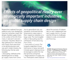 Researchers explored how geo political rivalry over strategically important industries impact the design of global supply chains in the context of the US-China rivalry in rare earth and semi-conductor industries. Based on data gathered from interviews with supply chain executives in the semiconductors and rare earth metals industry, the following key themes were revealed: