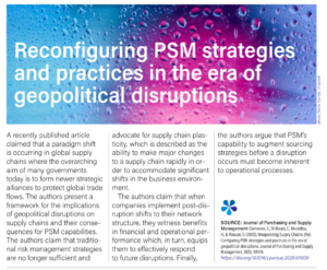 SOURCE: Journal of Purchasing and Supply Management Carnovale, S., Di Mauro, C., Moradlou, H., & Roscoe, S. (2025). Weaponizing Supply Chains: (Re) Configuring PSM strategies and practices in the era of geopolitical disruptions. Journal of Purchasing and Supply Management, 31(3), 101038.